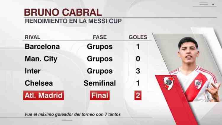 河床15岁小将布鲁诺·卡布拉尔本届梅西杯出战5场比赛,打进7球,包括决赛梅开二度,帮助河床夺冠,他获得了金靴奖,并当选赛事最佳球员。